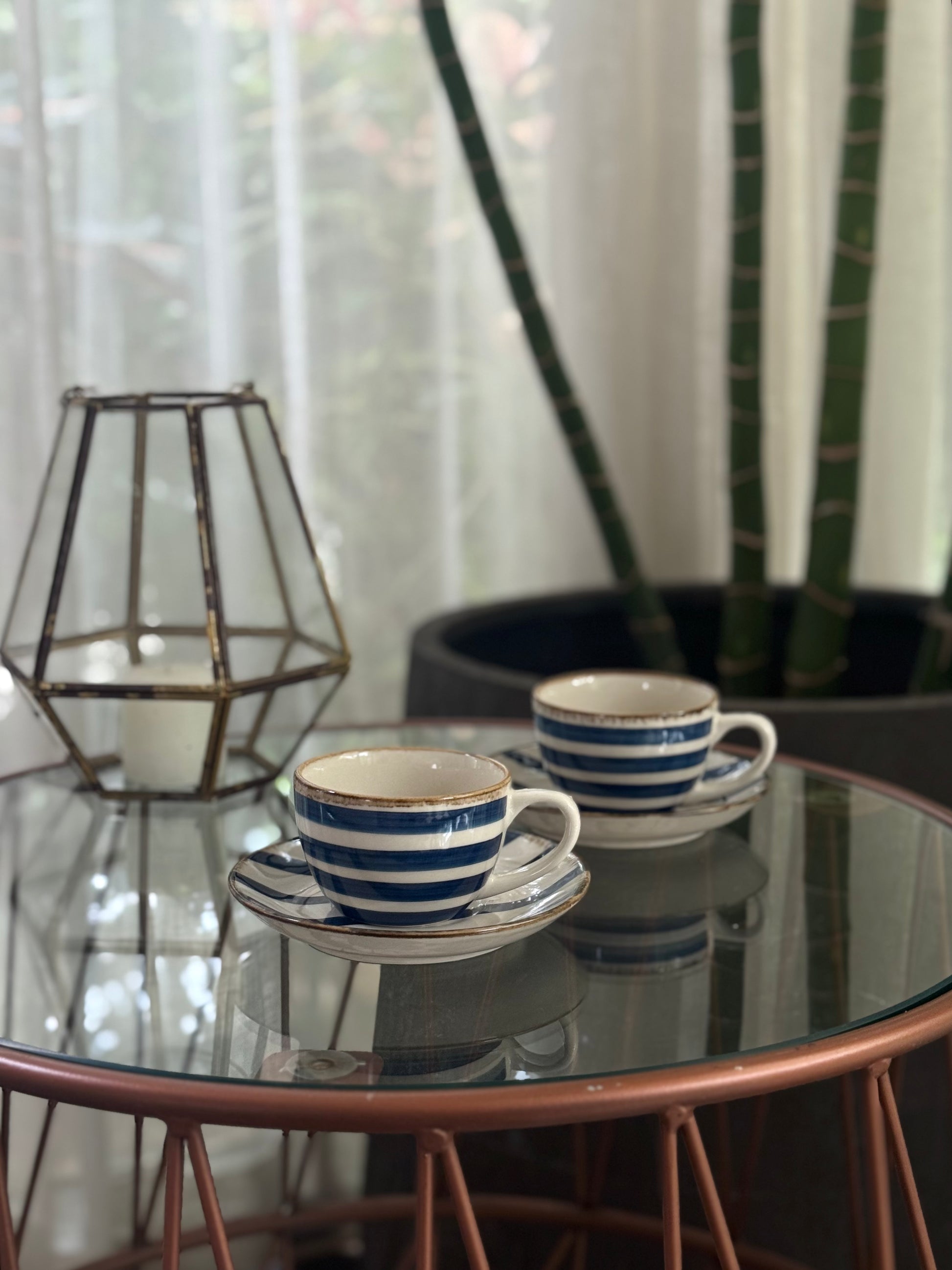 The Azure Tea Set brings together four tea cups hand-painted with deep indigo brushstrokes and finished with an overall glaze for a gentle sheen. Crafted in a rounded silhouette and sturdy ceramic, they are perfect companions for your tea moments. The blue and white lend a quiet freshness to your table. Ideal for both everyday rituals and as a thoughtful gift, this set balances simplicity with subtle character.