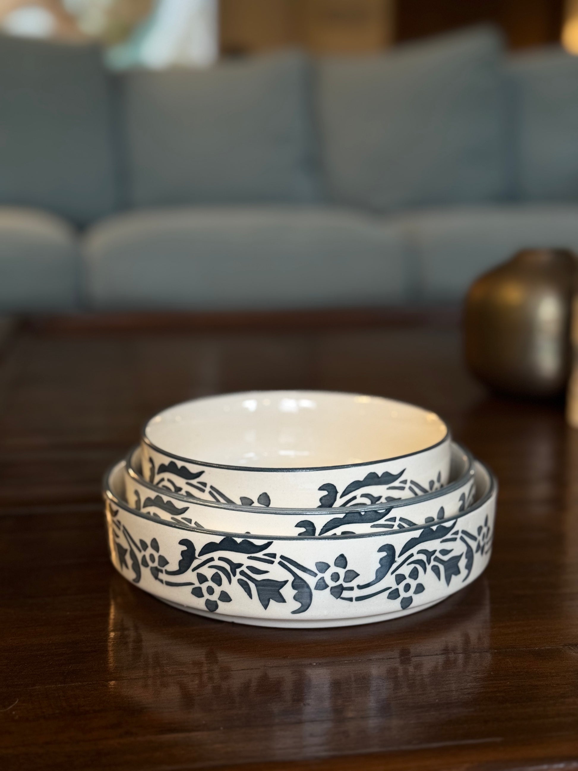 Crafted with a balance of traditional craftsmanship and modern minimalism, the Bluevine Plates Set brings versatility to your everyday table. These handcrafted plates feature hand painted motifs along the rim, perfect for biryani, pasta, curries, and side dishes. The subtle dept and varied sizing makes them ideal for everything under the sun, while their stackable design makes them as practical as they are beautiful.