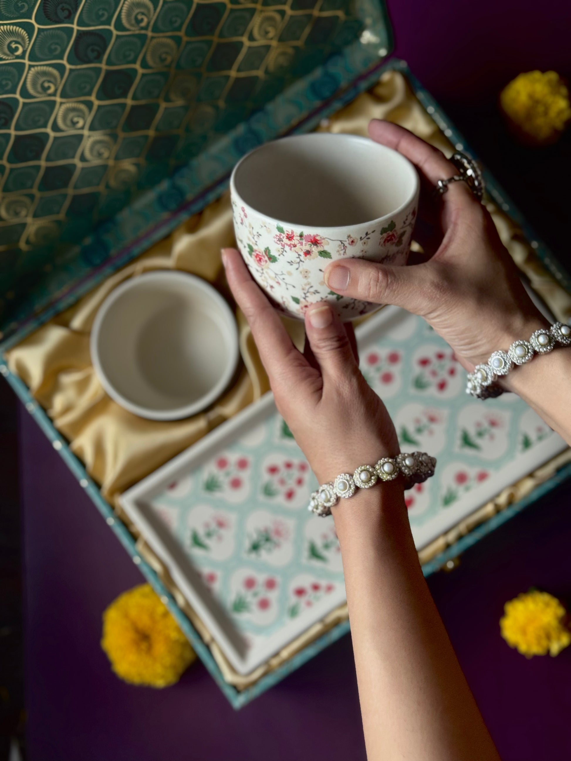 The Botanica Gift Set of 3 includes one elegant serving tray and two bowls, beautifully designed to bring the charm of a garden to your table. Scattered with delicate blossoms and trailing leaves on a soft cream base, the set feels like a serene meadow captured in ceramic.