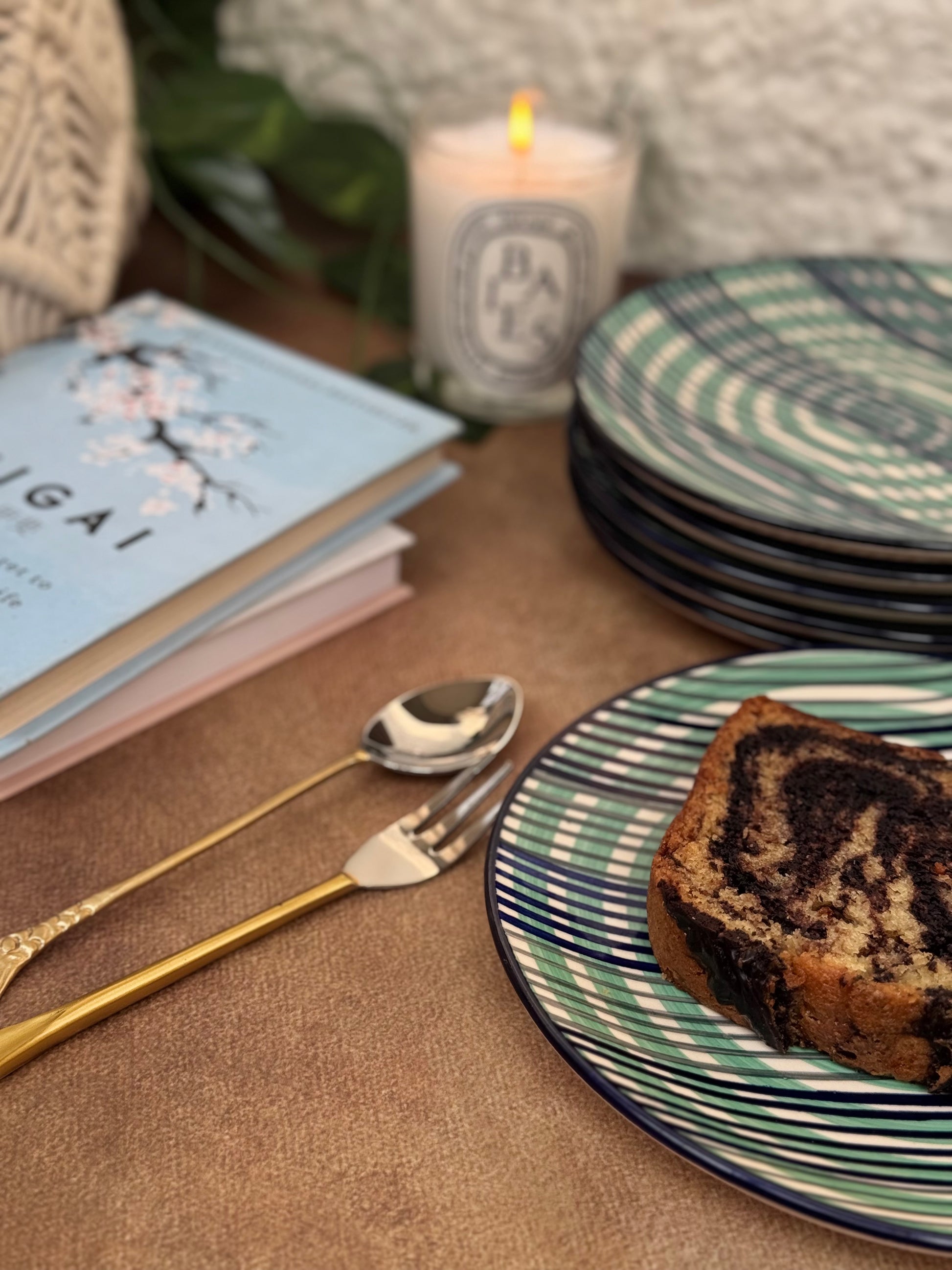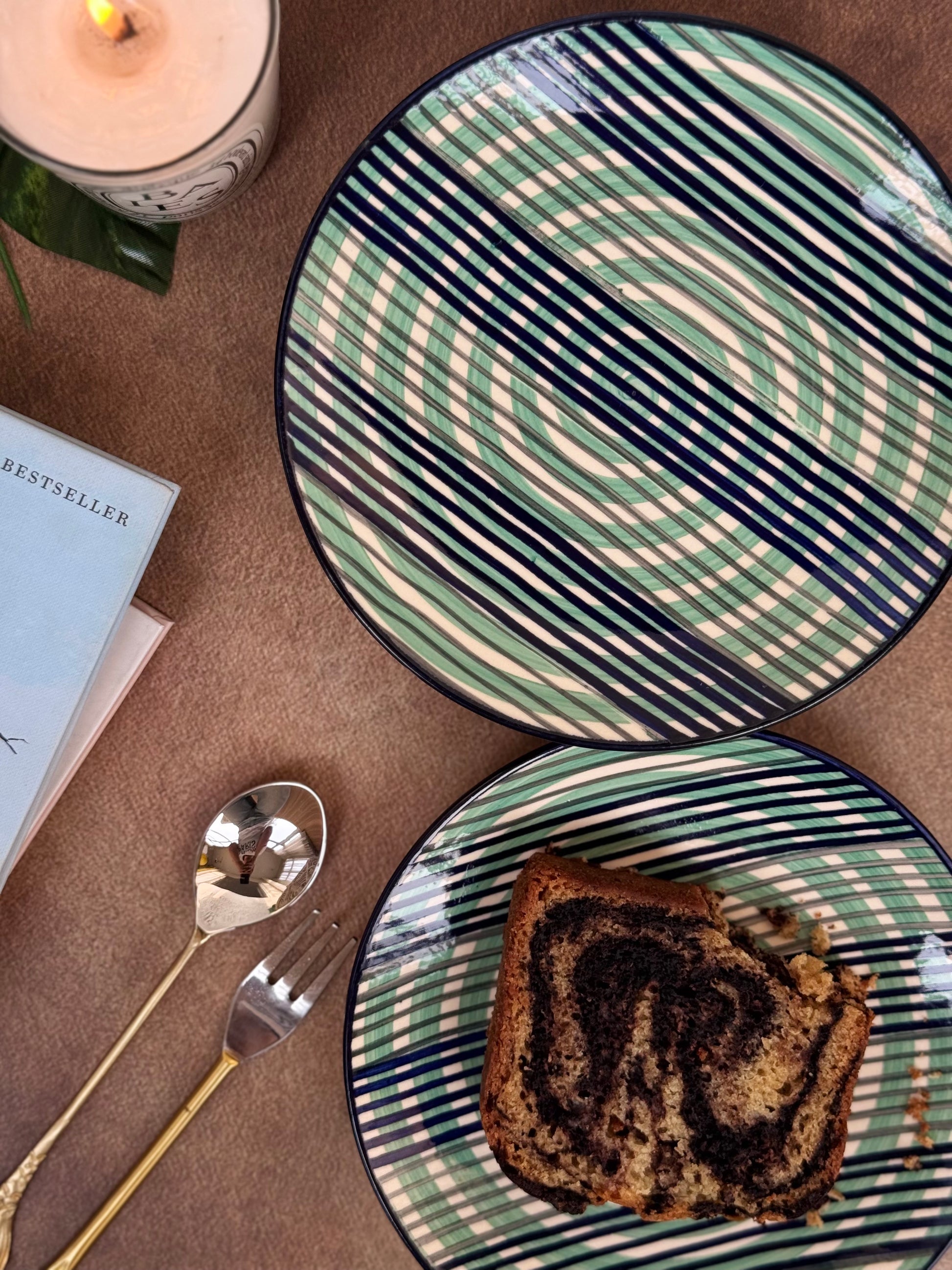 A set of six quarter plates finished with a graphic linear pattern in layered blues and greens. Designed for everyday use, these plates are ideal for serving toast, sandwiches, fruit, mithai, biscuits, or a slice of cake with tea. The size works well for quick breakfasts and light meals, while the bold pattern adds character without overpowering the food. They’re the kind of plates you reach for without thinking—practical for family meals, casual get-togethers, or keeping a few always in rotation. Easy to stack and comfortable to use daily.